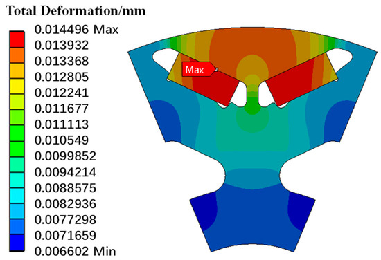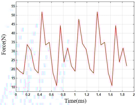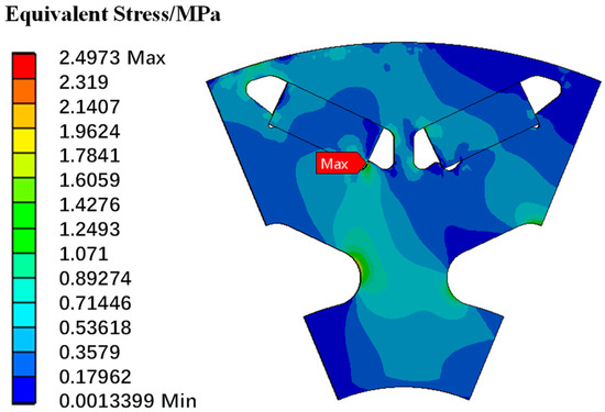 Figure 4 and Figure 5 show the electromagnetic force density and the electromagnetic force waveform on the rotor surface of the motor under extreme operating conditions, respectively. The rotor’s surface electromagnetic force density is represented by a short and dense blue arrow, with a maximum force of 52 N.m. The red arrow represents the electromagnetic force density at the winding coil. We extracted the electromagnetic force distribution on the rotor structure and imported the results into the structure field to analyze the stress distribution on the rotor structure. Figure 6 is a cloud diagram showing the stress distribution under the action of electromagnetic force alone. The maximum stress point of the rotor occurs at the junction of the permanent magnet and the rotor slot, with a magnitude of 2.49 MPa. Meanwhile, the stress at the magnetic isolation bridge is only 1.5 MPa. Therefore, the effect of the electromagnetic force can be ignored.