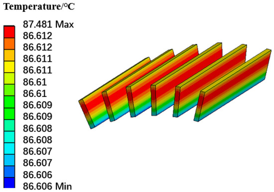 As shown in Figure 7 and Figure 8, the motor produced a temperature rise in all parts when operating under the test conditions, with the highest temperature of 87.481 °C occurring in the winding section. This is due to the high Joule heat generated by the three AC currents passing through the winding coil and the poor heat dissipation conditions around the coil. The stator core temperature is higher than that of the rotor area because the losses in the stator core are much higher than in the rotor core.