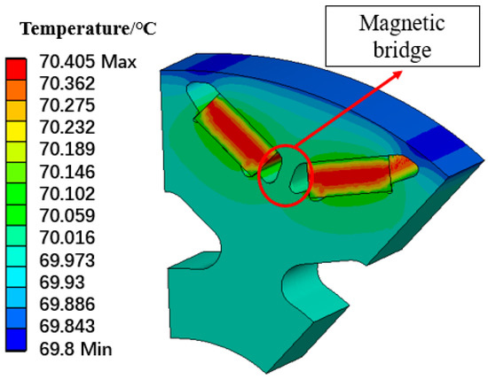 As shown in Figure 9, the highest temperature of the rotor occurs near the magnets, with a maximum temperature of 70.405 °C. Due to the relatively large eddy current losses in the permanent magnets, the rotor temperature decreases from the inside to the outside along the permanent magnet area, while the rotor core losses are mainly concentrated near the magnets. The temperature of the outer surface of the rotor is lower than the temperature of the entire rotor. With the change in rotation speed, the outer surface of the rotor will have a better air convection environment to dissipate heat, indicating that the temperature rise of the stator has little effect on the rotor due to the air gap between the stator and the rotor. Figure 10 shows the temperature change curve at the magnetic bridge.