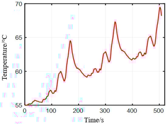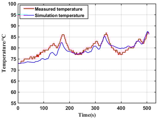 Temperature sensors were installed on the stator during testing. However, it was challenging to install sensors on the rotor’s rotating parts, and as a result, the rotor temperature followed the same trend as the winding temperature. To verify the accuracy of the simulation model established in this paper, the winding temperature data were monitored and compared with the simulated stator winding temperature during the bench test, as shown in Figure 11.