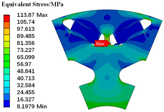 The contribution of simulated loads to magnetic bridge damage was analyzed for multiple physical fields, specifically at the rated extreme operating speed of 8907 rpm. The load simulation analysis under the electromagnetic, structural, and thermomechanical coupling fields indicates that the electromagnetic stress at the magnetic bridge is 1.5 MPa, the mechanical stress under the structural field is 113.87 MPa, and the combined stress under the thermomechanical coupling is 114.6 MPa. The electromagnetic and thermal stresses at the central magnetic bridge of a V-shaped permanent magnet synchronous motor are low.