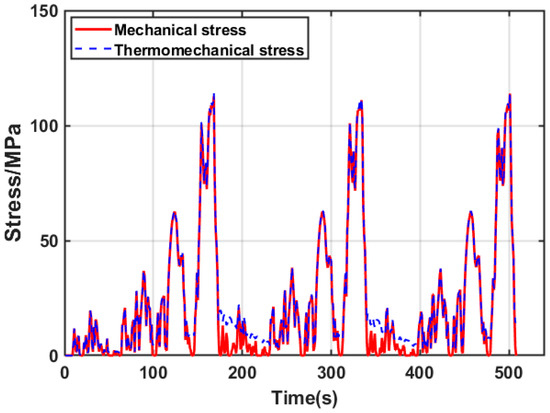 The internal rotor’s temperature constantly changes during the operation of the motor, and when the temperature rises, the fatigue strength of the rotor decreases. The temperature load histories obtained from the simulation of the magnetic bridge out in the thermal field are distributed jointly with the stress load histories obtained under structural field coupling, and the time duration at each temperature level and stress level is counted. According to the S–N curve of the material at different temperatures, the damage analysis of the rotor is carried out.