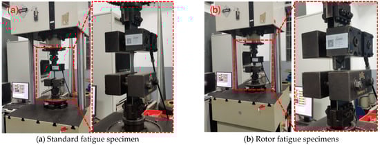 All fatigue tests were performed on a 100 kN RUMUL electromagnetic resonance fatigue tester [21], as illustrated in Figure 21. The stress ratio R was set to 0.1, the test frequency was approximately 40 Hz, and tests were conducted using secondary stress levels with maximum stresses of 450 MPa and 350 MPa. Fatigue tests were conducted at both 20 °C and 150 °C, as the S–N curve of the rotor laminations also varies at different temperatures, allowing for further consideration of the effect of temperature on rotor life.