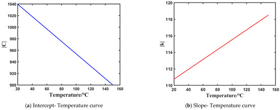 The S–N curve is fitted using a logarithmic coordinate system, where the horizontal axis represents stress levels and the vertical axis represents the logarithmic value of the number of cycles. Under this form, the S–N curve typically presents a linear shape, where the slope k and intercept C of the straight line are both material parameters. By extracting the values of the slope k and intercept C of the material’s S–N curve under ambient and high-temperature conditions, the S–N curve under other temperature conditions can be extrapolated using linear interpolation. The resulting graph is shown in Figure 23 below: