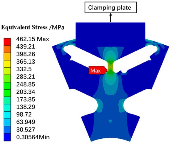 When conducting fatigue tests on rotor blades, the fatigue specimens need to simulate the centrifugal force load of the rotor under high-speed rotation. As shown in Figure 24, the centrifugal force is simulated by applying tensile loads on the test machine. Three typical operating conditions are selected for loading during the test process: 400 N, 500 N, and 600 N. Figure 24 shows the stress distribution of the motor rotor laminations under a tensile load of 600 N, and the presence of the clamping plate above the rotor facilitates the addition of tensile loads in the finite element setting. The analysis results show that the maximum stress occurs at the center inter-pole bridge, with a magnitude of 462 MPa. The stress levels corresponding to the weak positions under 500 N and 400 N are 425 MPa and 388 MPa, respectively.