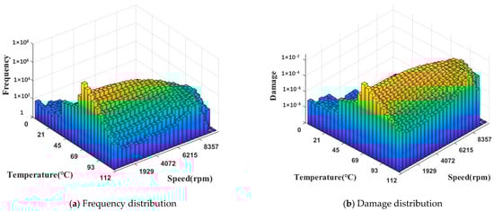 The experimental conditions for the rotor fatigue aging coupled failure mode can be selected based on the overall distribution of temperature and speed. By jointly counting the temperature and speed distribution of all user data, the frequency under different load levels is calculated and shown in Figure 26a. Using Equations (9) and (10), the damage distribution under different load levels is calculated and shown in Figure 26b. Three reliable test conditions are selected: low speed/low temperature, medium speed/medium temperature, and high speed/high temperature, each lasting 100 s. The specific test condition points are shown in Table 5. It can be seen from the frequency distribution and damage distribution curves that the proportion of low-speed working conditions and the corresponding damage ratio are relatively high. At this working condition, the rotor temperature is mainly distributed between 45 °C and 69 °C; therefore, the first working condition point selected is 640 rpm and 60 °C. When the speed is in the range of 4072 rpm to 8357 rpm, the motor is in the medium-speed working condition. The overall damage distribution of the rotor under this condition is not only high but also relatively uniform. At this point, the rotor temperature is mainly distributed between 69 °C and 112 °C; therefore, the second working condition point selected is 6640 rpm and 90 °C. The core of preparing the acceleration test load spectrum is to transfer the damage from small loads to large loads based on the principle of damage equivalence in order to shorten the test time. Therefore, although the frequency and damage ratio of the high-speed working condition are not high, the third working condition point selected is 10,070 rpm and 110 °C, which belongs to a relatively harsh working condition.