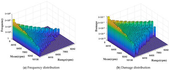 The typical operating conditions for the rotor under alternating cyclic fatigue failure mode can be selected based on the overall distribution of the mean and range of the rotor speed. By performing rainflow counting on the rotor speed data for all users, the frequency distribution under different means and ranges of rotor speeds is obtained, as shown in Figure 27a. The damage distribution under different means and ranges of rotor speeds can be calculated using Formula (11), as shown in Figure 27b. Based on the distribution of the load, the range of the rotational speed was roughly divided into three zones: (0, 3500) for the low-rotational-speed range, (3500, 7000) for the medium-rotational-speed range, and (7000, 10,000) for the high-rotational-speed range. One larger and more frequently occurring operating condition was selected from each range, and the final operating condition points were selected as shown in Table 6.