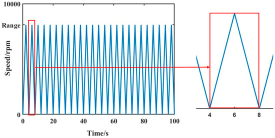 As shown in Figure 26, 60 °C is the most frequent temperature point, and this temperature point is also a relatively balanced result. Therefore, setting the temperature of all three operating conditions to 60 °C is reasonable. Each operating condition lasts for 100 s, and the rotational speed rises from 0 to the maximum range and then drops to 0 for one cycle, which lasts for 4 s. One complete operating condition lasts for 25 cycles, as shown in Figure 28.