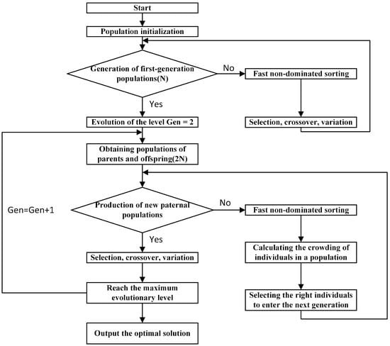 NSGA-II is one of the most commonly used multi-objective genetic algorithms in engineering applications. It is an optimization algorithm based on the first-generation algorithm and has the advantages of fast convergence, wide applicability, and good robustness. The specific solution process of the NSGA-II algorithm is shown in Figure 29.