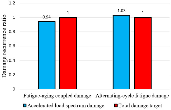 The number of cycles for the test conditions in Table 7 and Table 8 was allocated according to the proportion of the total time spent in a single operating condition, and the final load spectrum for the accelerated test of the motor rotor was obtained, as shown in Figure 30. The total time for a single cycle of the load spectrum was 4600 s, and the total test time to reproduce the rotor life cycle damage target was 716 h. As shown in Figure 31, the damage recovery ratios for both failure modes were close to one, indicating that the accelerated test load spectrum can reproduce the total damage over 300,000 km. Ultimately, the accelerated test load spectrum operating for 716 h can reproduce the user’s operating time to 11,571 h at 300,000 km, with an acceleration factor of 16.16.