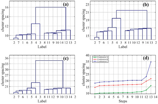 Since the sun elevation angle during the 4.2 field experiment was 40 degrees, data collected while the incidence angle in the laboratory is also 40 degrees are picked for analysis. The polarization information at each wavelength was divided into three combination sets: combination A consisting of Stokes data, combination B consisting of Stokes and DOLP, and combination C consisting of Stokes, DOLP, and pBRDF matrix elements. Three different combination matrices were obtained, and half of the vectors in each combination matrix were selected as training set data. Samples were taken from each combined data matrix, and the cluster distance was calculated. The training set was then used in the hierarchical clustering part to run a complete clustering tree as shown in Figure 3a–c.