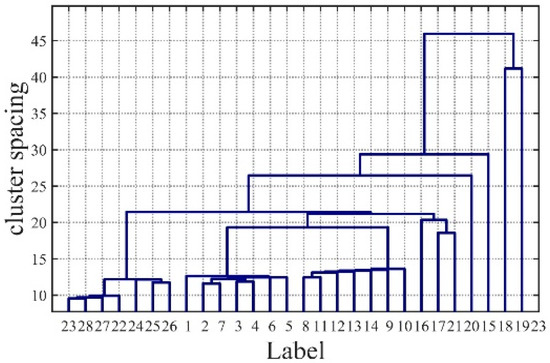 The maximum value of a cluster of two points can only be established by HAC using a small-scale test set. In this paper, the number of initialized clusters was set to 1 to obtain a complete clustering tree with all distances of the clustering hierarchy. The standardized European Target Miles was selected as the measurement standard, and its target function is shown in Equation (1). When the number of clusters in the test set is known, the distance dist is calculated by obtaining the weighted mean of the normalized Euclidean distance between the minimum vector cluster and the normalized Euclidean distance within the maximum vector cluster for the specified number of clusters . Once the distances are obtained, the remaining data are trained and hierarchical cluster is used until there are no more clustering distances less than or equal to . The hierarchical tree is then cut into clusters to achieve different numbers of clusters. The number of clusters can be allocated from 1 to t (where t is the number of clusters of the final result). At this point, the number of cluster K is the initial cluster of the FCM algorithm, and the cluster is the initial cluster of the FCM algorithm.