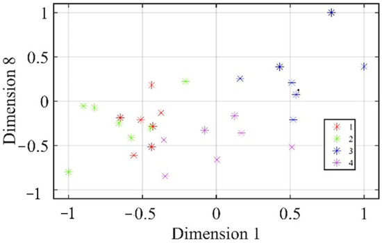 The data profile parameters and data matrix obtained from the previous HAC were input into the FCM algorithm to obtain the classification results. The Kosko subset measure of the algorithm results was then used to test for ambiguity, and the results were compared and analyzed. Because the amount of data was small, the FCM threshold was set to 0.01 and the maximum number of iterations to 1000. After the clustering algorithm ran and the clusters to which each data point belonged were obtained, the values of all dimensions were first normalized to facilitate observation and comparison of the abscissa. Then, the classification results were projected to the first row of each data in the reorganization matrix above the first dimension and the eighth dimension, forming a two-dimensional clustering scatter diagram as shown in Figure 5. In the figure, data points of the same color belong to the same cluster, which is identified as a material. In the parallel pre-experiment of the six small data sets, the four types of materials were correctly identified and distinguished, and the correct rate of division for the sampling points of each material reached 100%. These experimental results prove the correctness of the algorithm theory and the practicality of implementing it.