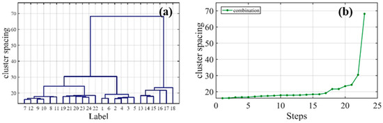 The algorithm proposed in this paper must rely on the material’s own spectral polarization characteristics, making full use of characteristic parameters that can accurately characterize the spectral polarization characteristics of the space debris. Through the selection of different data combinations, it has been proven through experiments that the optimal data set combination is selected, which is consistent with the results of the characteristic data. Ultimately, the combination of Stokes and DOLP data is chosen as the final data set. Figure 6 depicts the hierarchical clustering tree and line graph of cluster distance in the experimental field spectral polarization characteristic data, from which the critical value of cluster distance ε = 24.9133 is derived. Using this threshold, clustering continues. However, due to the large amount of data, it is not intuitive to directly draw the cluster diagram. According to the clustering result itself, the number of clusters is calculated to be 6.