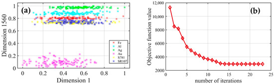 The scatter diagram in Figure 7a shows the projection of the data vector’s first dimension and 1560th dimension based on the clustering algorithm, and it demonstrates that the six types of points can be separated normally. After setting the threshold, the objective function decreases with each iteration. When the FCM iteration threshold is set to 0.001, the change trend of the objective function J with the number of iterations is displayed in Figure 7b. From the figure, it is evident that the objective function eventually converges to the approximate global optimal value with the increase of the number of iterations, and the decline speed is fast. The convergence is accomplished in 21 iterations, demonstrating the effectiveness of the algorithm developed in this research.