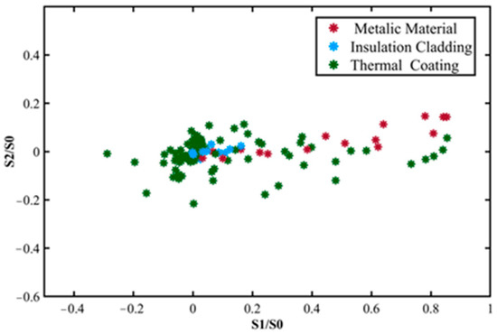 Figure 11 depicts the spectrum curves of six types of space debris materials. As shown in the figure, there is little variation in the wavelengths of the characteristic peaks obtained from different materials. Moreover, the commonly used characteristic parameter half-wave width cannot clearly distinguish the spectral characteristics of different materials. Therefore, spectral characteristic data cannot be used as a basis for directly distinguishing space debris materials. Figure 12 and Figure 13 directly classify space debris materials based on their Stokes vector and degree of polarization, respectively. However, it can be observed that the classification results are not satisfactory.