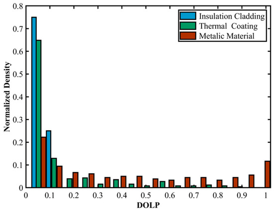 Probability density distribution characteristics of the degree of polarization for different space debris materials.