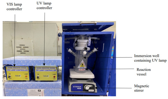 Figure 1 shows the set-up of a laboratory-scale photochemical reactor (Lelesil Innovative Systems). The photochemical reactor consists of a reaction vessel that has a 1.5 L capacity and an immersion well made of quartz, which houses the UV lamp. A cold-water circulating tank is used to cool down the immersion well that contains the lamp. A 250 W, 365 nm mercury UV and UV-Vis lamp was used.