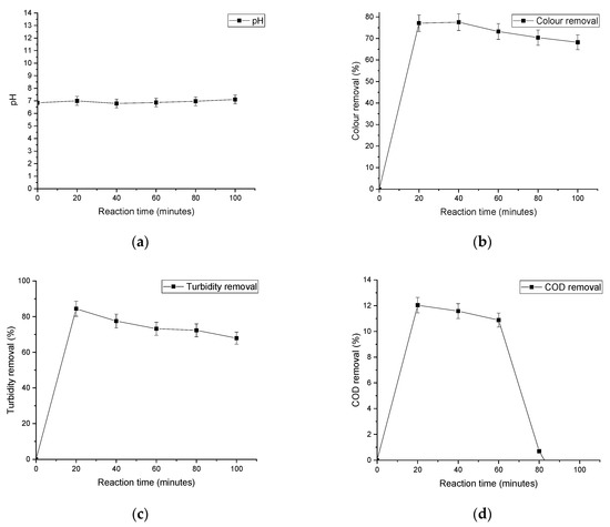 For this experiment, the effect of reaction time on the output parameters was studied. The reaction time was varied from 20 min to 100 min, while the mixing speed and catalyst load were kept constant at 60 rpm and 0.9 g/L, respectively. The reaction time had minimal effect on the pH (Figure 2a), as the pH values remained almost constant, ranging from 6.79 to 7.11, further validating the minimal effect reaction time had on pH, as the pH also remained close to the characterized wastewater pH of 6.85. Constant pH suggests that the products of photocatalysis had no significant influence on pH.