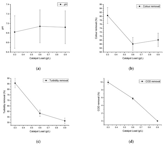 Trends of the effect of catalyst load on photocatalysis treatment parameters: (a) The effect of catalyst load on pH; (b) The effect of catalyst load on colour removal; (c) The effect of catalyst load on turbidity removal (d) The effect of catalyst load on COD removal (reaction time of 60 min and mixing speed of 60 rpm).
