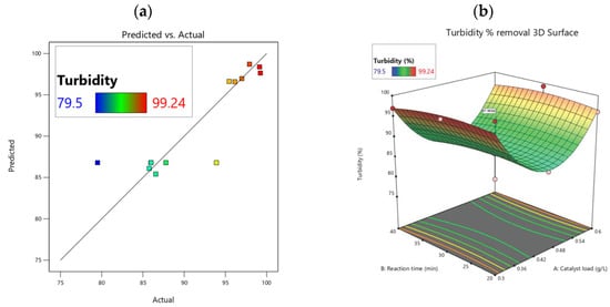 The predicted values were plotted against the experimental values using an experimental predicted data interactive plot to approximate the extent of the correlation. Figure 5a depicts a reasonably strong linear correlation between the experimental and predicted data with a high regression coefficient (Table 5), with only a couple of data points as outliers. The standard error (SE) for the line of best fit showed an insignificant deviation, as the p-value was less than 0.05 at a 95% confidence level. The modified RSM and Central Composite Design (CCD) (RSM-CCD) were used to demonstrate the interactive impact of the input parameters (factors) on the output parameters (response). Figure 5b displays the presence of interactions between the factors, catalyst load, and reaction time on the turbidity response. The graphical demonstration of the three-dimensional (3D) surface plot of the response model was selected based on the interaction of the significant factors that play a role in maximizing the desirability of the system. A curvature of considerable magnitude can be seen in Figure 5b. This curve also suggests that the correlation between the factors (AB) and the response (turbidity) were well-fitted on a quadratic function (Equation (3)). Graphically (Figure 5b), it was demonstrated that the response surface showed an arc with the optimal region for turbidity at the high-low levels of A (catalyst load), whilst the turbidity removal remained constant along the varying reaction times and therefore did not have as significant an effect as the catalyst load.