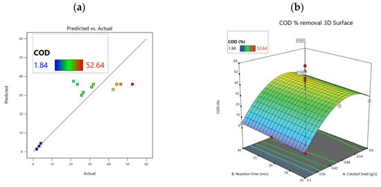 (a) Actual vs. predicted values of COD removal; (b) 3D surface plot of COD removal.