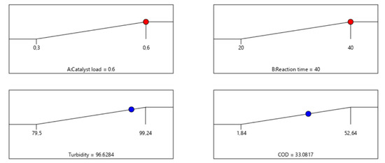 To optimize the experimental design, constraints (Table 8) had to be implemented. Specific to this case, all input and output parameters (factors and responses) were maximized. This generated 8 solutions (Table 9), and one was selected as the optimal solution (Figure 7) as it presented the highest desirability of 74.7% removal efficiency. The optimal solution suggests a turbidity and COD removal of 96.6% and 33.1%, respectively, were attained at a catalyst load of 0.6 g/L and a reaction time of 40 min.
