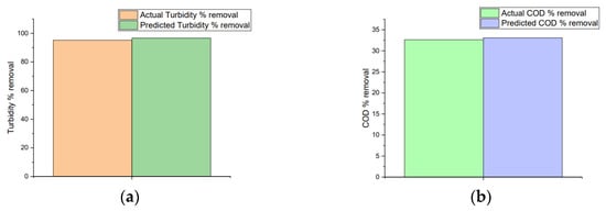 (a) Actual vs. predicted values of optimal turbidity removal; (b) Actual vs. predicted values of optimal COD removal.