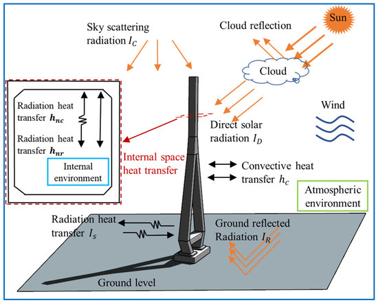 The heat exchange between the bridge structure and the external environment under the action of sunlight mainly includes three parts: direct solar radiation, convective heat transfer, and radiation heat transfer, as shown in Figure 1.