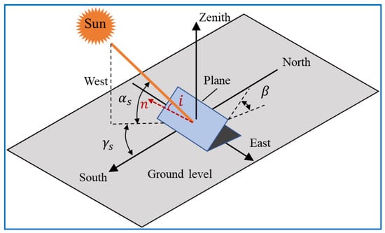 The relative position relationship between the surface of the structure and the sun is shown in Figure 2. The angle between the sunlight and the exterior normal of the surface, that is, the incident angle , is calculated by the following formula: