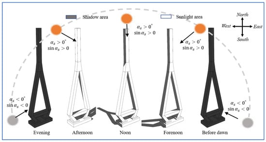 - The relative position relationship between the sun and the structure at this time was determined according to the calculation theory of the position parameters of the sun described in Section 2.1.1 after the extraction of mesh information from the surface of the model.