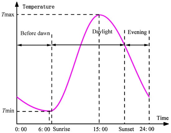 It is reasonable to assume that the atmospheric temperature of the whole day changes according to the sine function in the numerical simulation of the sunshine temperature field of the bridge structure. The piecewise sine function model shown in Figure 4 is used in this study to simulate the change in temperature in a day. The specific calculation formula is [32,33]: