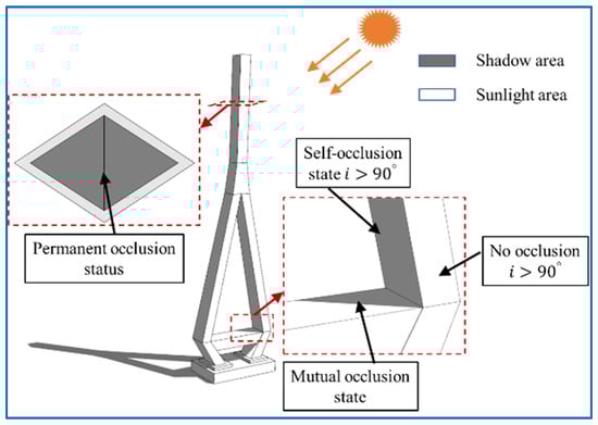 Shadow occlusion caused by sunlight can be divided into the following four types based on the existing research: no occlusion, self-occlusion, mutual occlusion, and permanent occlusion [35], as shown in Figure 5.