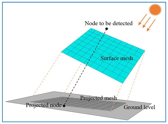 The projection method of the node to be detected and the structural surface grid are shown in Figure 7. The geodetic plane was used as the projection surface, and the illumination direction of the sunlight was used as the projection direction.