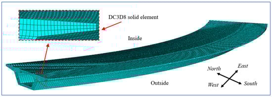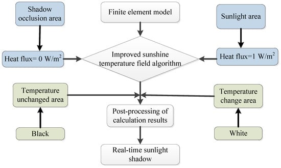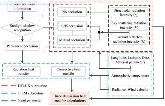 In this paper, the DFLUX subroutine and FILM subroutine provided by the Abaqus platform are used for the secondary development of the software to realize the calculation of the three-dimensional sunshine temperature field of the structure. The DFLUX subroutine can apply the surface heat source controlled by the user-defined heat source equation to the selected structural surface [36]. In the DFLUX subroutine, the sunshine shadow recognition algorithm described in Section 3.2.1 was introduced to load the solar radiation heat load according to the real-time sunshine shadow recognition results. The FILM subroutine can define the heat transfer coefficient related to the ambient temperature and model parameters [36]. Therefore, the heat transfer coefficient generated by the convection and radiation heat transfer between the structural surface and the environment was loaded by the FILM subroutine, and the specific loading is shown in Figure 10. First, we input the geographic location information: date, the extreme value of ambient temperature, wind speed, material emissivity, and other parameters. Secondly, we completed the real-time sunlight shadow recognition of the structure through the shadow occlusion recognition algorithm in Section 3.2. Finally, the corresponding boundary conditions were applied to the surface of the structure through the calculation theory of heat transfer boundary conditions in Section 2.1, Section 2.2 and Section 2.3, and the three-dimensional sunshine temperature field of the structure was calculated using the finite element method.