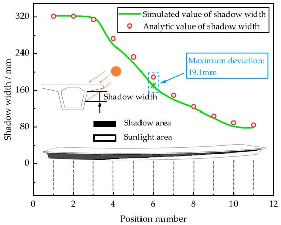 - The real-time shadow occlusion state was successfully displayed through the improvement of the three-dimensional sunshine temperature field simulation algorithm in this paper and the cloud image customization function in Abaqus software Version 6.10., and the real-time sunshine shadow width identified by the algorithm was compared with the theoretical value calculated by the theoretical formula. The maximum difference between the two was only 19.1 mm, which proves that the sunshine shadow recognition algorithm proposed in this paper has extremely high recognition accuracy.