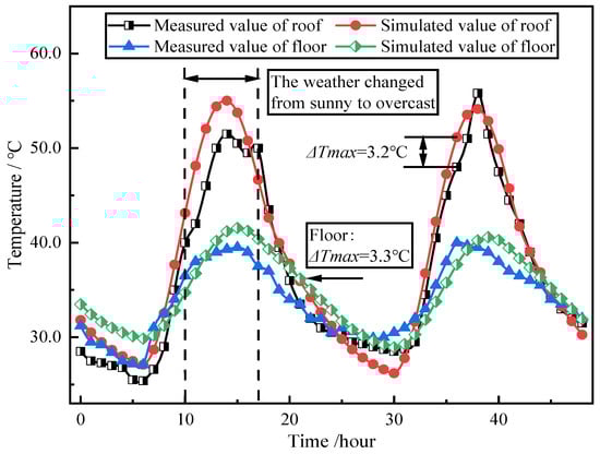 In the formula, is the natural convection heat transfer coefficient, which is taken as [31]; is the radiative heat transfer coefficient, ; is the radiance; and are the temperature of the air in the internal space and the temperature of the internal surface of the structure, respectively.
