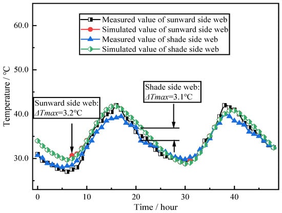 It can be seen from the variation curve of the temperature difference between the opposite faces of the tower column in Figure 21 that the temperature difference () between the south wall and the north wall is small in one day, and it is within 5 °C throughout the day. The temperature difference between the east wall and the east side of the inner side () and the temperature difference between the west wall and the west side of the inner side () are large during the sunshine period. The maximum temperature difference between the east wall and the east side of the inner side can reach 10.9 °C, and the maximum temperature difference between the west wall and the west side of the inner side can reach 11.6 °C, which is far more than the recommended temperature difference (±5 °C) given in the ‘Design of Highway Cable-Stayed Bridge’ (JTG/T 3365-01-2020) [8] (the negative value represents the difference between the shadow shielding surface and the solar irradiation surface, and the positive value represents the difference between the temperature value of the solar irradiation surface and the temperature value of the shadow shielding surface).