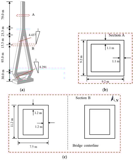 Ren et al. [9,10] analyzed the change of the temperature difference along the height and thickness of the tower wall with time in different seasons and obtained the most unfavorable distribution of the positive and negative temperature difference based on the monitoring temperature data of the concrete tower of a suspension bridge, but did not give the change rule of the temperature field in different directions. Yang et al. [11] analyzed the temperature field of the bridge tower of the Anqing Yangtze River Bridge based on the monitoring data. The results show that the temperature of the shaded part is much lower than that of other parts, and the temperature of the external surface and the ambient temperature have the same trend. Additionally, the difference between the temperature of the structure and the air can be well-fitted. Zhang et al. [12] studied the temperature field of a concrete bridge tower through the monitoring data. The results show that the maximum temperature difference and the most unfavorable temperature effect on the bridge tower appear in winter. Zhou et al. [13] collected the temperature monitoring data of a bridge in one year based on the health monitoring system of a bridge, analyzed the distribution law of the sunshine temperature field of the bridge, and put forward a calculation mode of the vertical temperature gradient and temperature difference of the bridge tower.