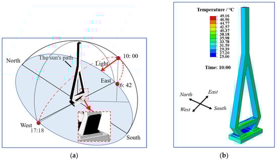 Shadow occlusion state and temperature field cloud of the bridge tower at 10:00 a.m. (a) The shaded state of the bridge tower surface; (b) the temperature field cloud map.
