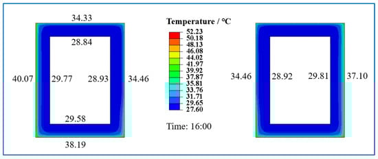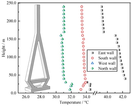 Figure 20 shows the surface temperature changes with the height of the four wall surfaces of the bridge tower (the external surface of the east tower wall, the south tower wall, the west tower wall, and the north tower wall) at 10 a.m. It can be seen from the figure that the shadow has a significant impact on the temperature change of the tower wall surface. The temperatures of the external surfaces of the east tower wall and the south tower wall irradiated by the sunlight are higher than those of the external surfaces of the west tower wall and the north tower wall, which are always in shadow. Because the incidence angle of the sunlight on the external surface of the east tower wall is smaller than that on the external surface of the south tower wall, the external surface of the east tower receives more solar radiation, and its temperature is higher than that on the external surface of the south tower wall. On the external surface of the east tower wall, the surface temperature of the lower tower column is significantly lower than that of the upper tower column and the middle tower column because the lower tower column is in shadow. It can be seen from the above that the influence of shadow shading must be considered when analyzing the three-dimensional sunshine temperature field of the bridge tower.