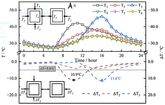 Figure 21 shows the change curve of the external surface temperature (T) of the tower wall at the 125 m height of the bridge tower and the change curve of the temperature difference (ΔT) between the opposite sides of the tower columns (the east wall, the south wall, the west wall, the north wall, the inner east side, and the inner west side refer to the wall surface of the measuring points T1, T2, T3, T4, T5, and T6 in the figure, respectively). It can be seen from the figure that in a day, the surface temperature changes are the same; from night to early morning, the surface temperature of each surface was in a state of continuous decline, but the trend of temperature reduction gradually slowed down, reaching the lowest value at about 6 a.m. In the daytime, due to the influence of solar radiation and ambient temperature changes, the temperature of each wall surface showed a trend of rising first and then falling. The temperature of the eastern wall surface, which was first irradiated by the sun, rose faster than that of other surfaces, reaching its maximum at about 10 a.m., followed by the south wall surface irradiated by the sun. However, due to the large incident angle of the sun on the south wall surface, the amount of solar radiation received by the wall surface was small, so the temperature rose slowly. Finally, the west wall surface was irradiated by the sun. Because of its small incident angle, the surface temperature rose rapidly and reached its maximum at about 4 p.m. Because the north wall was in a shaded state throughout the day, its surface was not irradiated by the sun, and only convection heat transfer and radiation heat transfer were performed with the ambient temperature. Therefore, the temperature change was relatively slow, and the temperature change throughout the day was small. The overall variation of the surface temperature of the tower was consistent with the law obtained in reference [39].