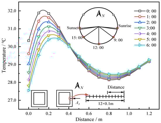 Figure 22, Figure 23 and Figure 24 show the temperature change along the thickness direction of the east tower wall at the height of 125 m. It can be seen from the figure that the temperature change was relatively obvious at a range of 0.3 m from the external surface of the tower wall, and the temperature change was small in the remaining range because of the thermal insulation effect of concrete materials during the night and early morning periods. In the daytime, the radiation of the sun and the change in the ambient temperature made the temperature at a range of 0.3 m in the thickness direction change obviously, but the weak thermal conductivity of the concrete material led to the temperature in the thickness direction of the tower wall. The temperature at a range of 0.8 m from the external surface showed a gradual downward trend, while in the area beyond 0.8 m from the external surface, the temperature rose slightly due to the heat transfer and the thermal insulation of the concrete material itself.