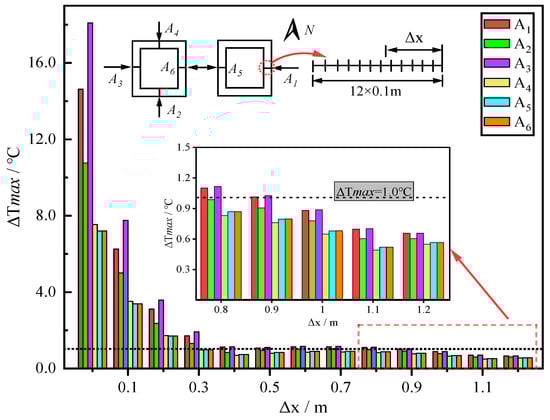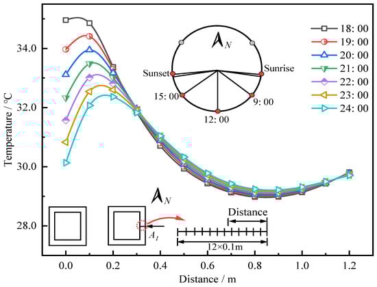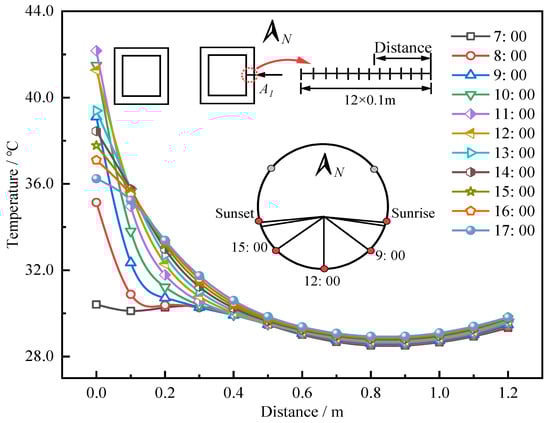 Figure 25 shows the maximum variation of temperature difference at the same distance from the outer surface in the thickness direction of each wall in a day. It can be seen from the figure that the temperature change was more significant at a range of 0.3 m from the outer surface. When measured more than 0.8 m from the outer surface, the temperature change was less than 1 °C.