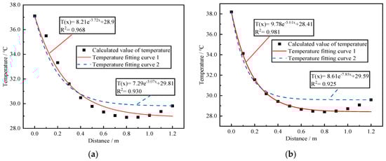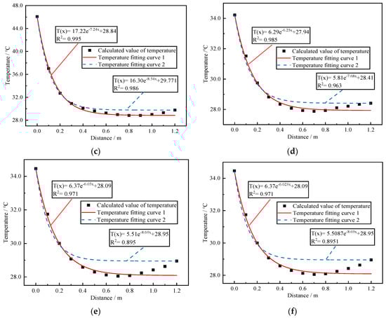 The fitting results of discrete temperature data. (a) The east tower wall; (b) the south tower wall; (c) the west tower wall; (d) the north tower wall; (e) the inner east tower wall; (f) the inner west tower wall. Note: The temperature fitting curve 1 in the figure is the result of fitting the temperature value at 0.8 m from the external surface as the parameter C in Formula (33); the temperature fitting curve 2 is the result of fitting the temperature value of the internal surface as the parameter C in Formula (33).