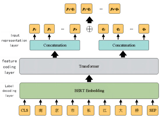 To prevent error propagation caused by the decline in the performance of Chinese word segmentation tools due to linguistic ambiguity, for example, “Peking University” may be split into “Beijing” and “University”, so that “Peking University” cannot be recognized as an entity. This model adopts a separate decoding approach for the boundary prediction task, which replaces the role of word segmentation in Chinese named entity recognition. As such, the network inputs the BERT Chinese pre-training model with word granularity only, as shown in Equation (2). For a given sequence T = [t1, t2, …, tn], the special categorical embedding ([CLS]) serves as the first token, and the special token ([SEP]) is added as the final token for word embedding, text embedding (which carries global semantic information), location embedding, and positional embedding to obtain the total character encoding.
