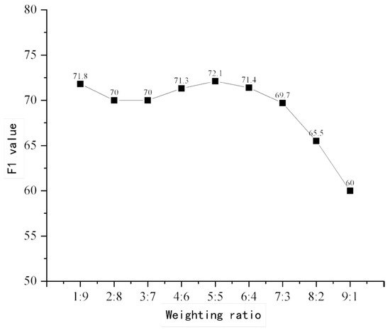 Variation of F1 values in relation to subtask weighting ratio.