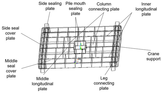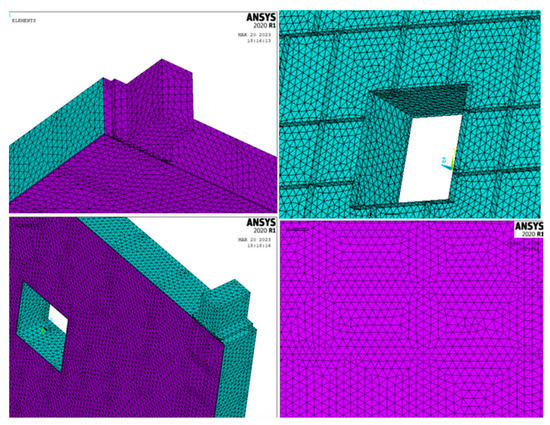 The large body structure of this model of the static pile driver is welded by steel plates and is a complex space box system structure. In order to ensure that the finite element analysis is carried out properly and effectively, the original model is simplified appropriately. Members without load-bearing effects were removed, details such as unnecessary holes and rounded corners were simplified, and legs attached to the bulk structure were simplified. In this paper, in order to facilitate the optimization analysis of the bulk structure based on its properties, we parametrically model it using the ANSYS APDL pc-software(Mechanical APDL 2020 R1, ANSYS, USA). Since the bulk structure belongs to a large thin plate structure, with a large difference between the thickness and the rest of the dimensions, the plate and shell units are chosen to simulate actual steel plates when modeling. The specific type is chosen from the shell 63 in APDL [17]. During the finite element analysis, the transmission of forces relies on the nodes between the units. In order to ensure that the finite element analysis is performed correctly, a proper meshing is particularly important. Therefore, in this paper, the model is meshed in the form of free triangles. The meshing of local locations in the model is shown in Figure 2.