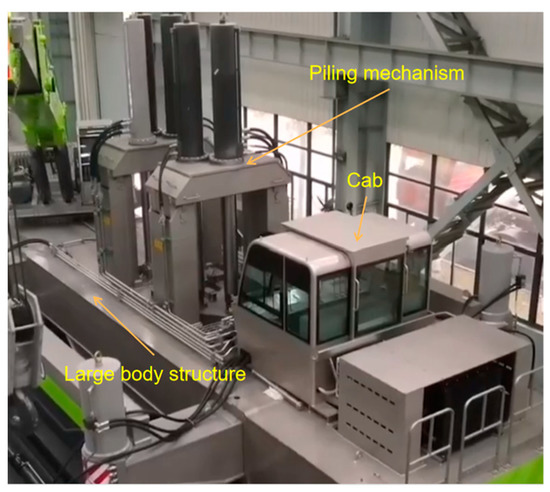 In civil engineering infrastructure, the most common form of foundation is the pile foundation. With the development of the mechanical engineering industry, the quality of pile pressing machinery has also developed for the better. In China’s economic construction, pile pressing machinery plays an increasingly critical role. There are various types of pile pressing equipment. The most common ones are as follows: barrel type diesel pile hammer, hydraulic pile hammer, hydraulic static pile hammer, hydraulic vibratory hammer, etc. [1,2,3,4,5]. Compared with other types of pile presses, hydraulic static pile presses have numerous advantages. First, the hydraulic static pile driver does not greatly affect the surrounding buildings or environment while working, so it does not cause damage to the land structure [6]. Secondly, when working, the top of the pile is not easily damaged and the whole pile body is not subject to bending. During the whole construction process, the noise and the vibrational impact on the ground can be ignored. Since the hydraulic pile driver is hydraulically driven, linear motion is easily achieved and the power utilization rate of the entire device is extremely high [7]. Finally, since the hydraulic apparatus has been kept in a relatively steady state during the operation, it is not difficult to achieve a stepless velocity regulation during the motion or over a wide range. As the manufacturing industry has developed, hydraulic components have also become more standardized, it has also become a more versatile part.. Hydraulic static pile drivers gradually became used in civil engineering, as they were more convenient for automated operation and protection against overload [8]. The hydrostatic pile driver is a piling machine that uses static pressure to press piles into various substrates, thus realizing the foundation for building implementation, as shown in Figure 1.