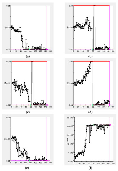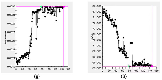 The value of each variable in the optimization. (a) The value of R1; (b) the value of R3; (c) the value of R4; (d) the value of R5; (e) the value of R6; (f) the value of stress; (g) the value of displacement; (h) the value of mass.